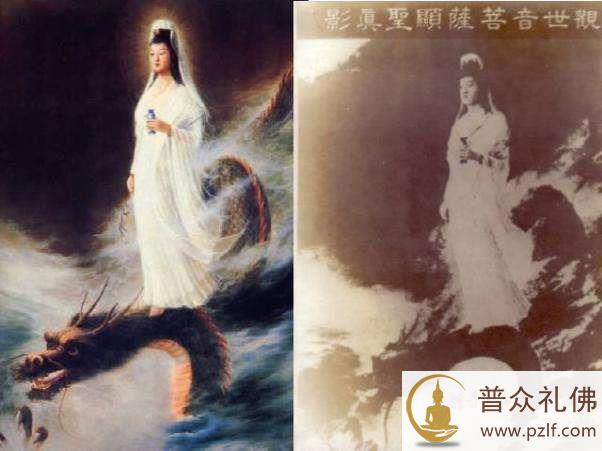 八七水灾(1980.8.7)台湾大肚溪,时直升机在上空视察灾情,见一片很特别的彩云,立即拍摄,却冲印出观世音菩萨显化救劫真影(看雪客注:此图广传于网络,难判真假。原图为右图,黑白。左为彩色加工)