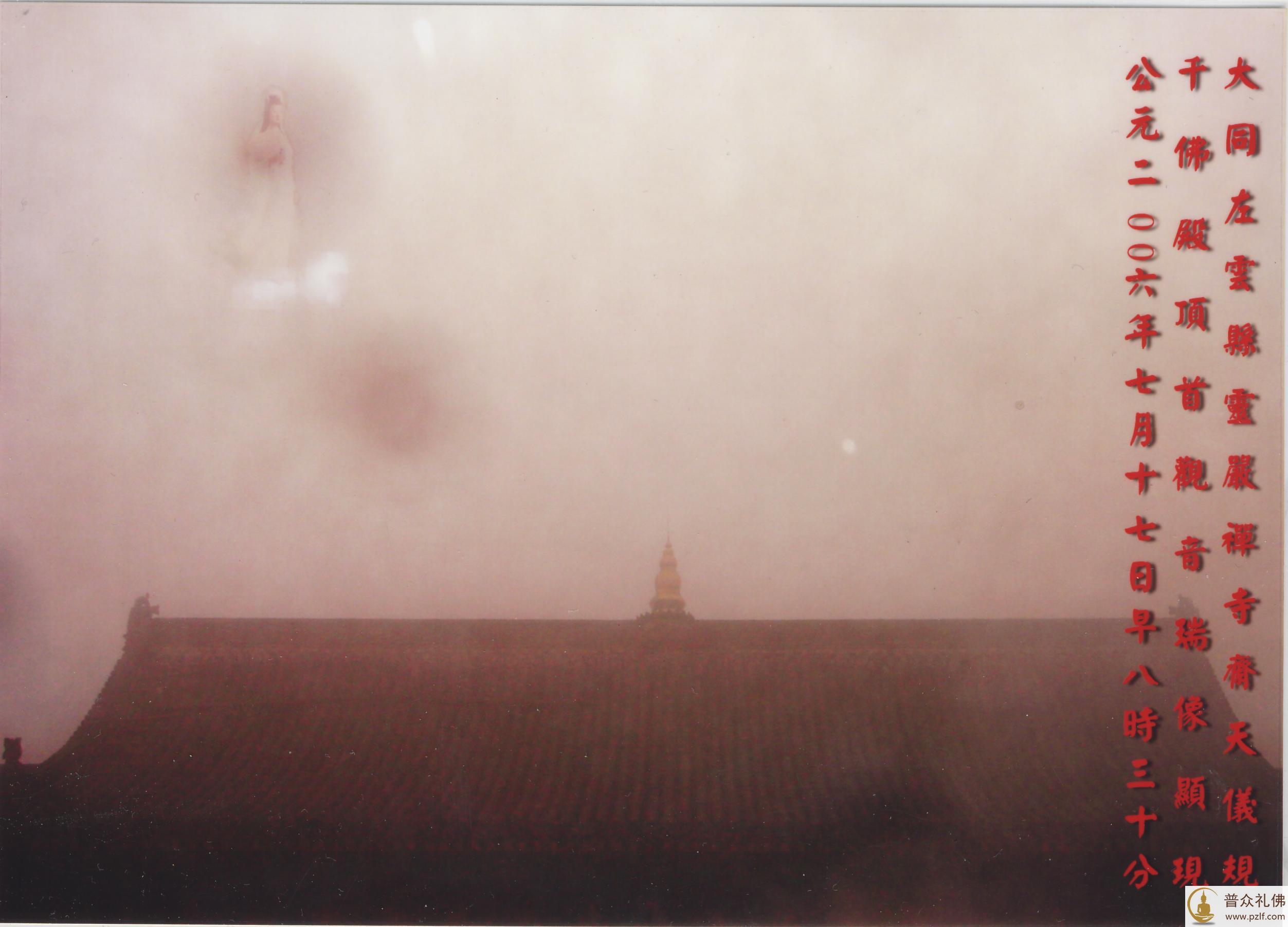 据称“以下是一九九八年七月二十七日(农历六月初五),山西省五台山白云寺住持上昌下隆法师在白云寺大雄宝殿开工奠基之际与诸位善信合影,照片冲洗出,西方极乐世界弥陀、观音、势至三位佛菩萨于空中显圣。” 但有人指出该图“是技术合成的”,并指出了“瞥脚的合成痕迹——下面人像身上留下了明显的后面背景图象的痕迹”。